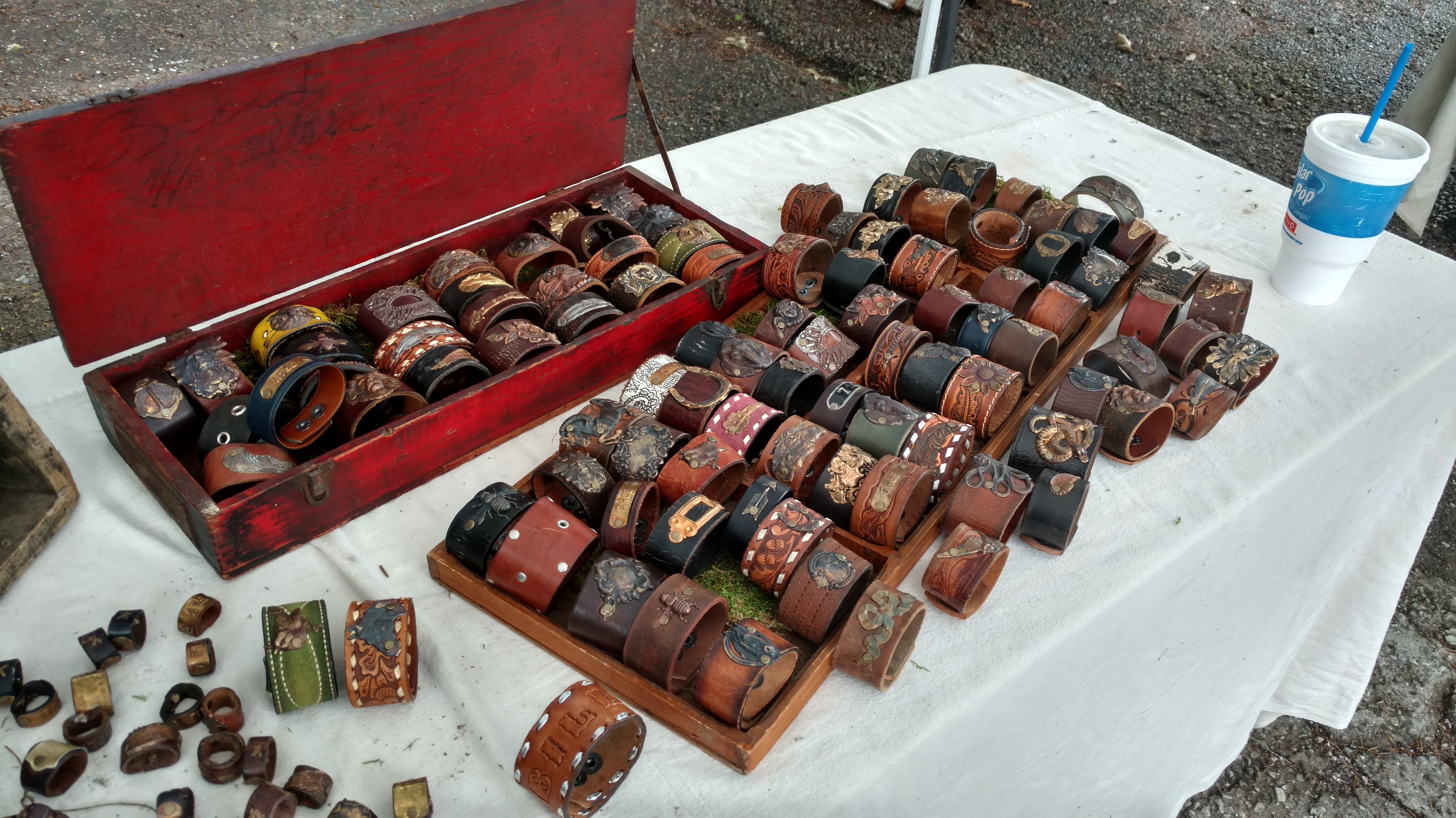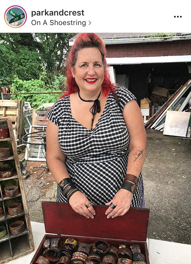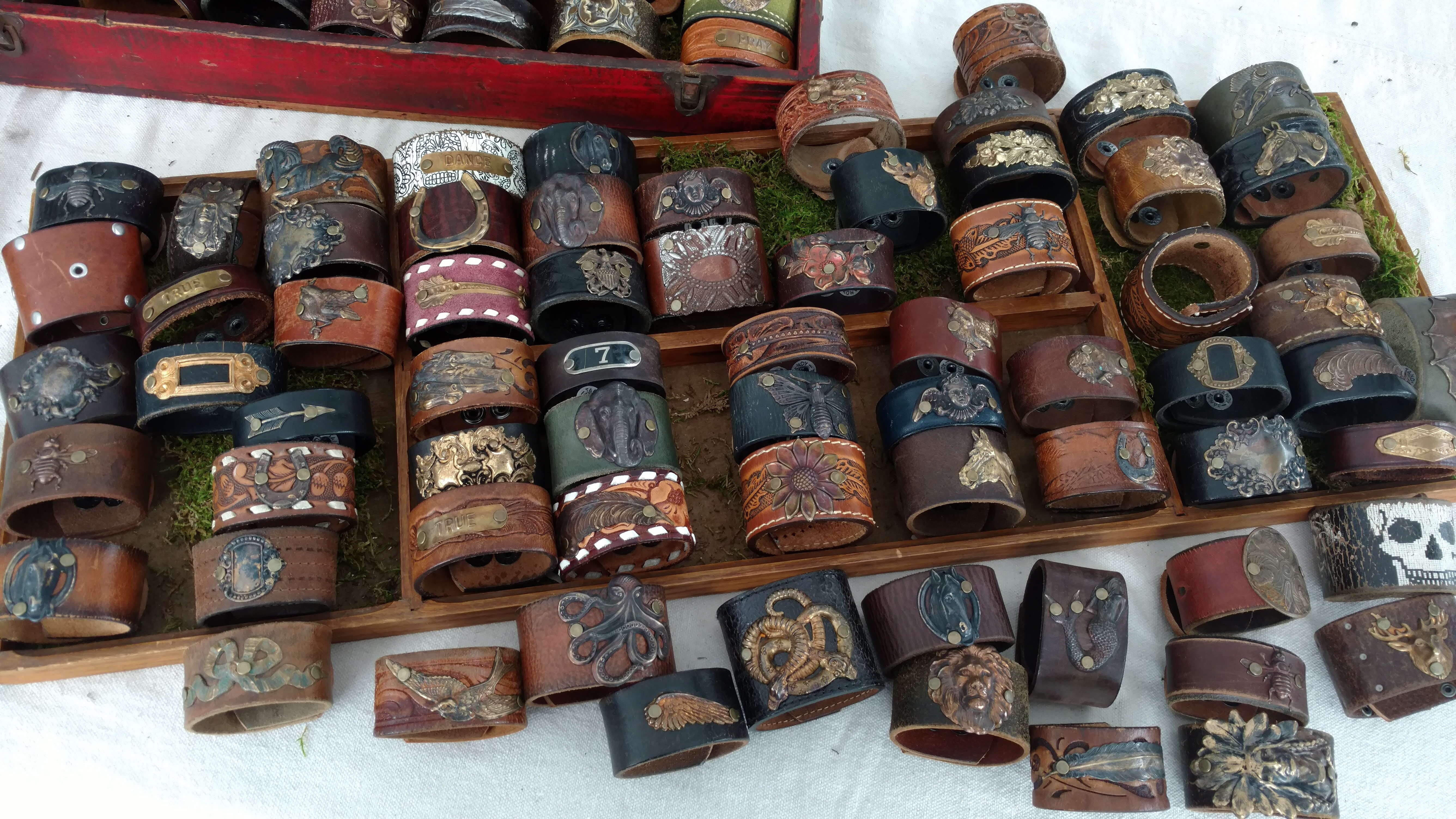 Bombshell Betty, artist Jodi Douglass displaying her handmade cuffs created from reclaimed leather. Betty is from the San Francisco Bay Area.